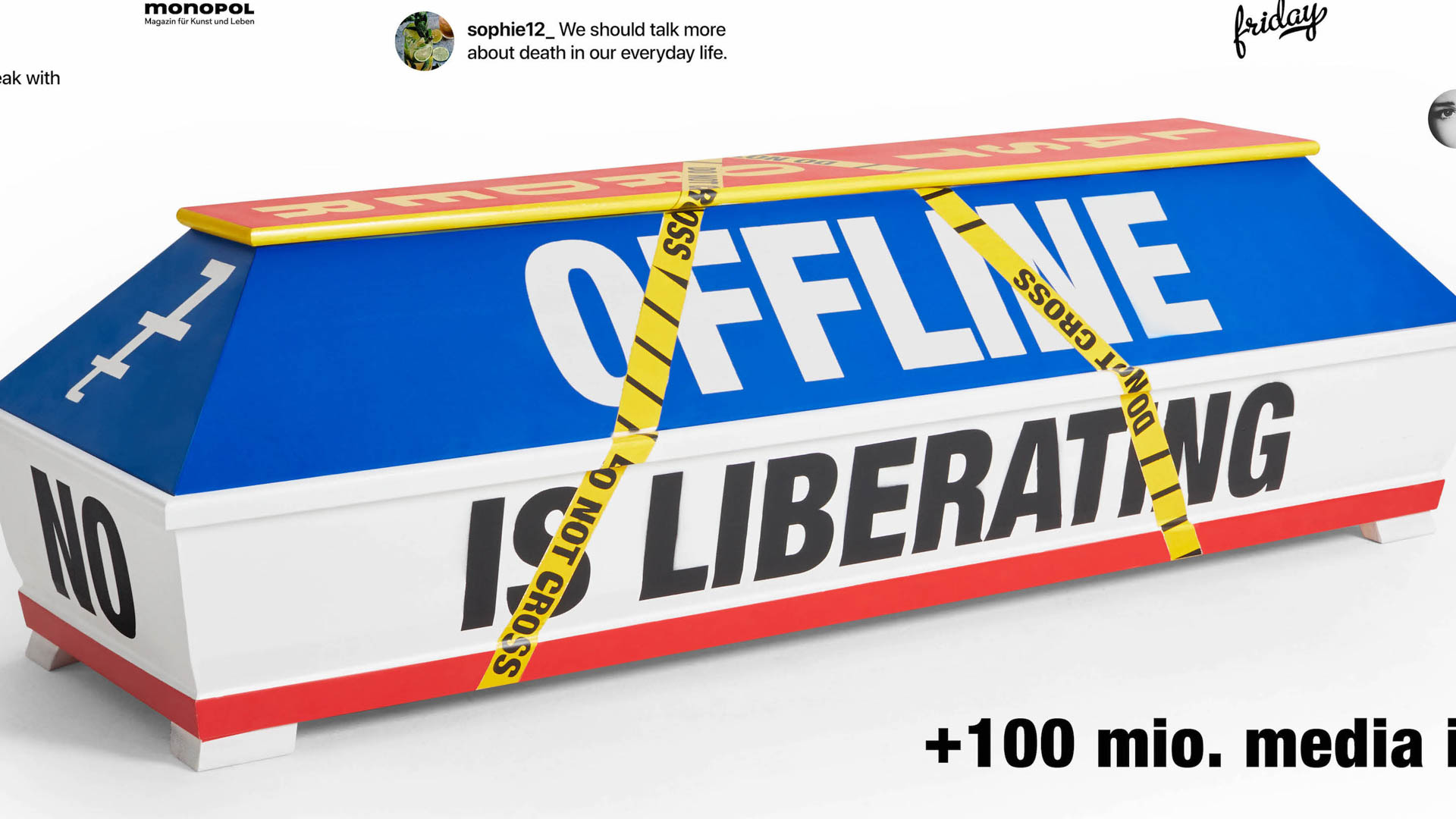 Fashion, sneakers, tattoos: As a society, we openly deal with pretty much everything using unique expression to support our strong opinions. Only when it comes to mortality, fear and uncertainty spread. Death is still a taboo in our society. Together we want to transform the status quo and promote a new progressive approach to understanding, dealing with and talking about death. For My Coffin, upcoming artists created unique coffins for famous German influencers. The coffins act as a catalyst for friction and ultimately discourse, especially in social media. Turning the coffin from a symbol of fear into a unique piece of art and make it "instagramable". 62% of Germans say death is life's biggest catastrophe. But only 32% want to think or talk about it. Germans do not mourn properly anymore. Death is anonym and not part of the society anymore. Death is a taboo. Key Message: Let us face death and talk openly about it. Aim is to reduce fear and to give hope to those who lost someone. Target audience: our aim was to reach the general public with a focus on a younger audience (up to 35 years old), who did not get in touch with decease and death.