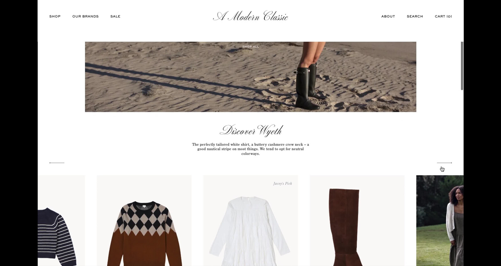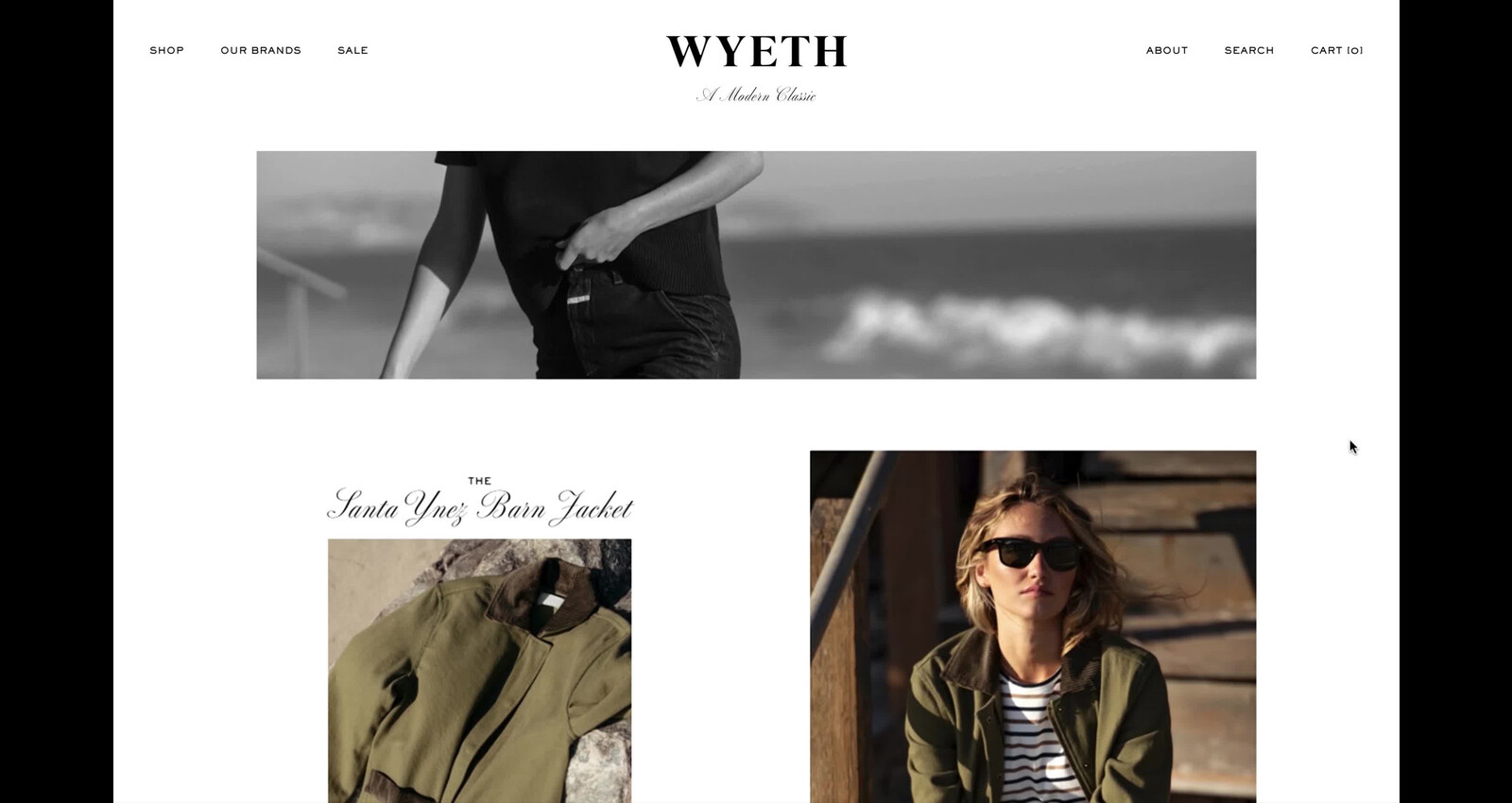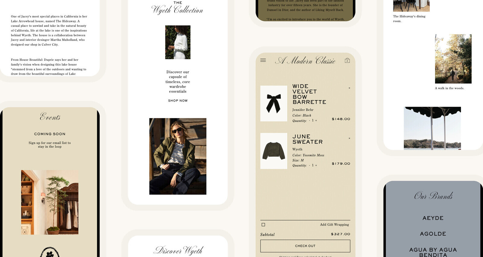 E-commerce website design for fashion brand Wyeth. Wyeth, a new modern classic, is a new fashion brand with a physical store at Platform in Los Angeles. The brand features high-quality garments, that are timeless in style and deeply rooted in California. The e-commerce website offers a glimpse into the world of Wyeth, with abundant lifestyle photography and editorial layouts that inspire, while preserving the effortless shopping experience at its core.